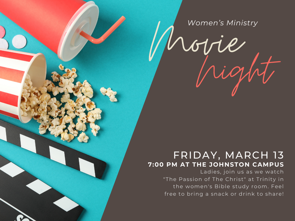Ladies, join us as we watch "The Passion of The Christ" at Trinity in the women's Bible study room. Feel free to bring a snack or drink to share!