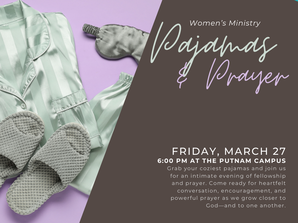Women's Ministries: Pajamas & Prayer Friday, March 27, 2026 6:00 PM 8:00 PM Google Calendar ICS Grab your coziest pajamas and join us for an intimate evening of fellowship and prayer. Come ready for heartfelt conversation, encouragement, and powerful prayer as we grow closer to God—and to one another.
